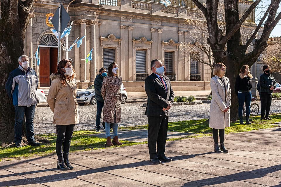 Luego del izamiento de la Enseña Nacional se entonaron las estrofas del Himno Nacional y seguidamente, el intendente Alberto Gelené, acompañado por Alejandra Vazano en representación del HCD, y la Inspectora Jefa Distrital, Prof. Alfonsina Ordoñe, colocaron una ofrenda floral en el busto a San Martín.