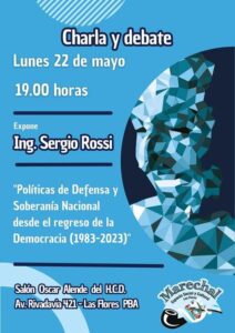 El próximo lunes 22 de mayo, a las 19 h, en el salón Oscar Alende del HCD, en el marco de los 40 años de Democracia en la Argentina, el Ing. Sergio Rossi ofrecerá una Charla y debate sobre «Políticas de defensa y soberanía nacional desde el regreso de la democracia (1983-2023).
